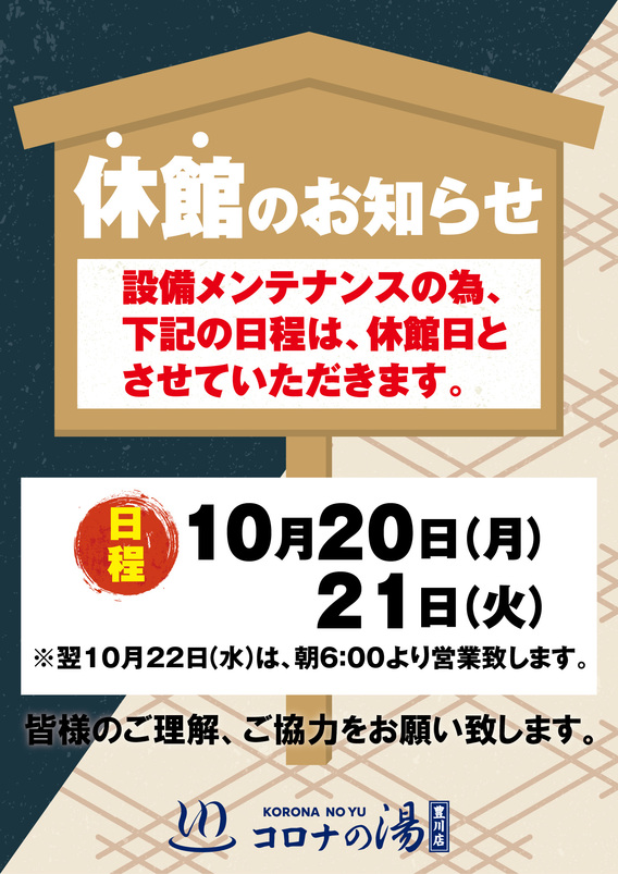 > 【コロナの湯】休館日のお知らせ(豊川店)