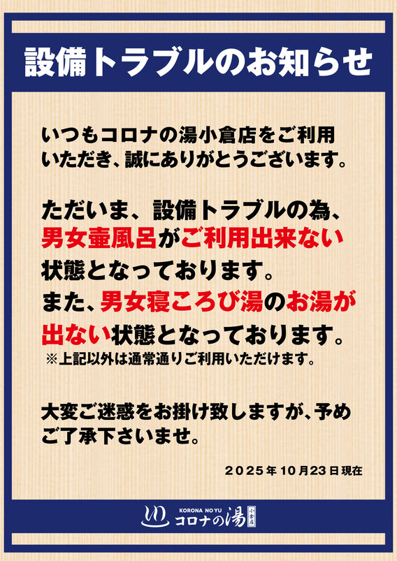 > コロナの湯小倉店 設備トラブルのお知らせ