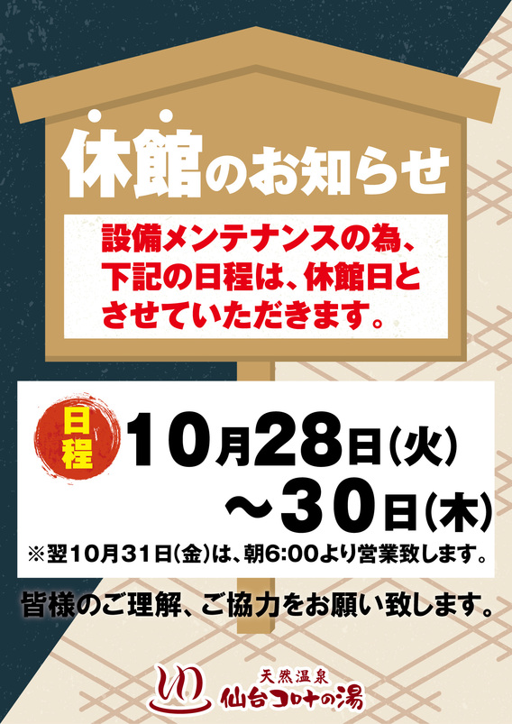 > 【コロナの湯】休館日のお知らせ(仙台店)