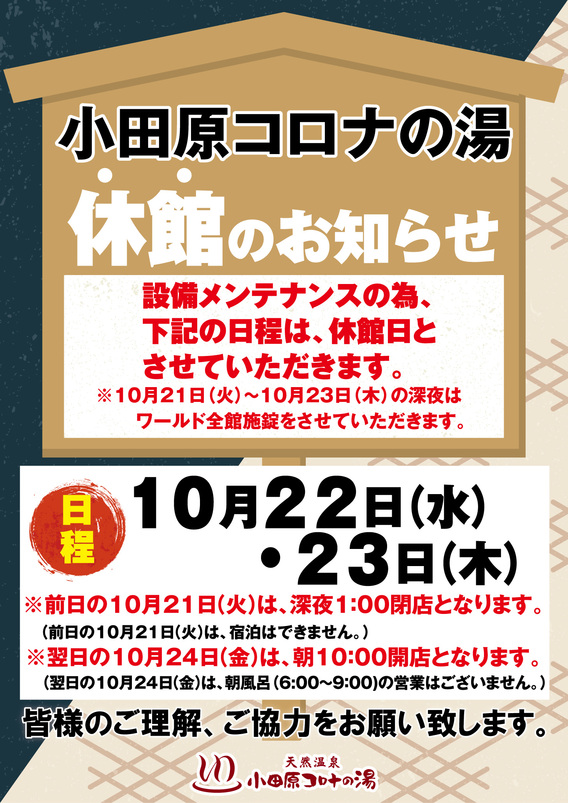 > 【コロナの湯】休館日のお知らせ(小田原店)