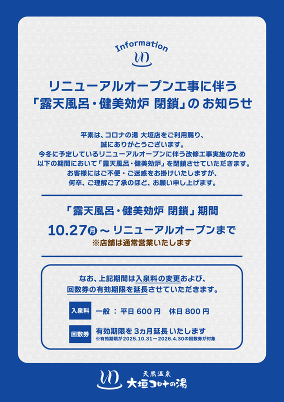 コロナの湯大垣店 露天風呂閉鎖のお知らせ