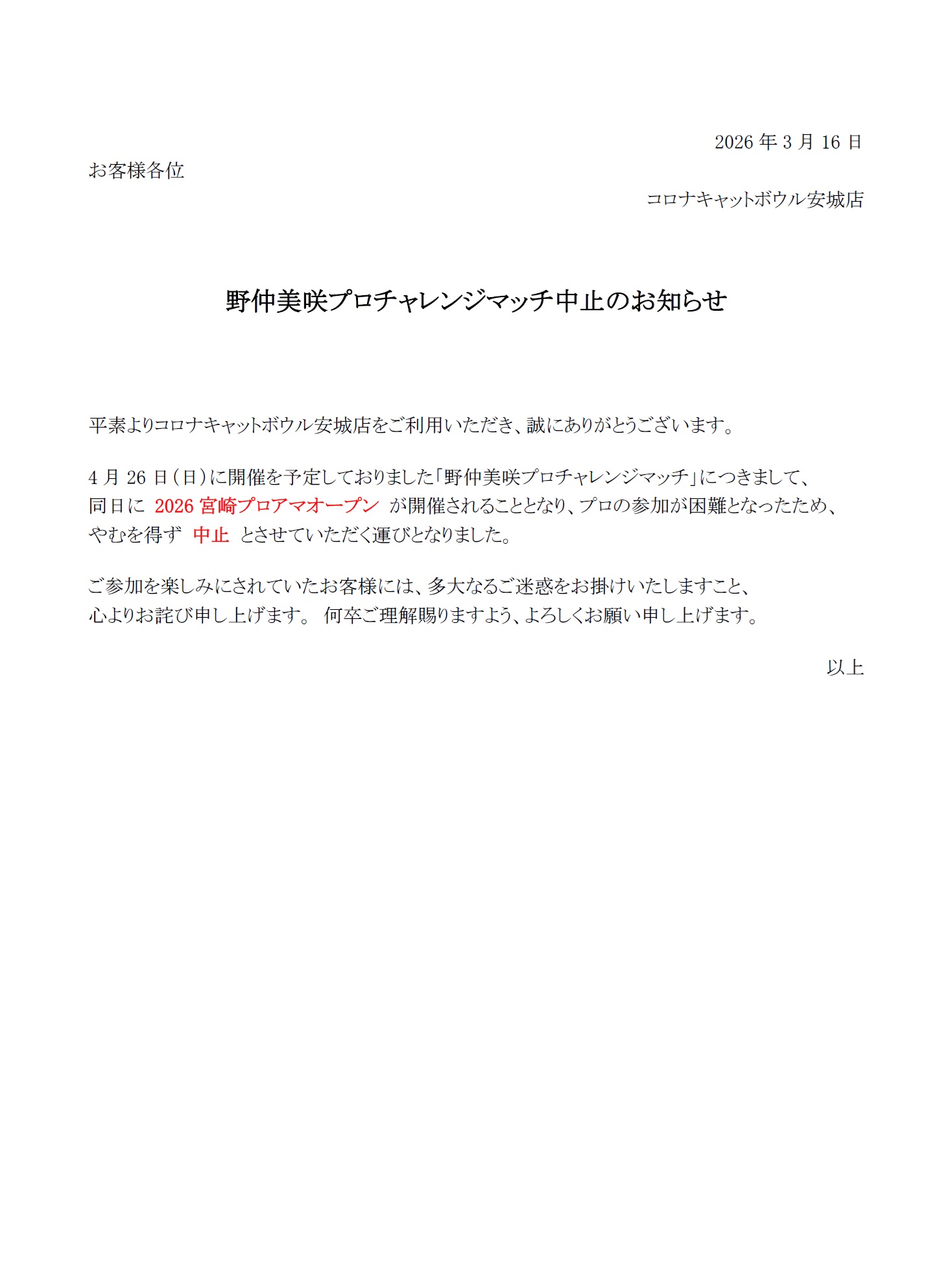 | 大会名 | 緒方美空プロ&緒方彩音プロチャレンジマッチ コロナワールドカップ2026 男子新人戦 予選対象大会 |