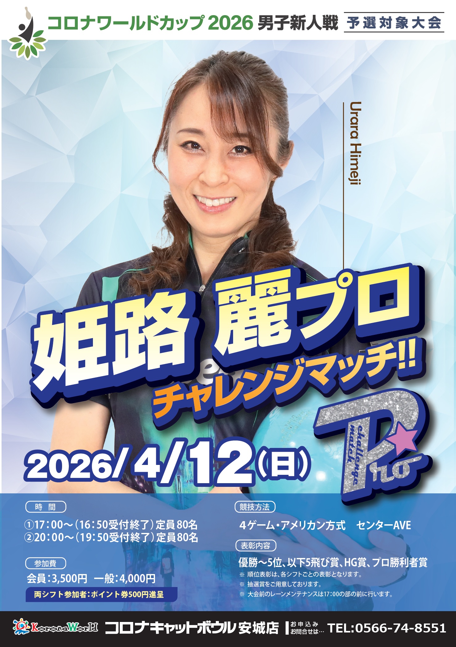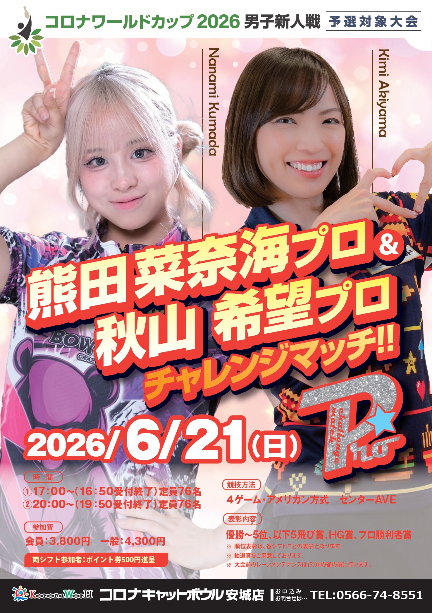 | 大会名 | 熊田菜奈海プロ&秋山希望プロチャレンジマッチ コロナワールドカップ2026 男子新人戦 予選対象大会 |