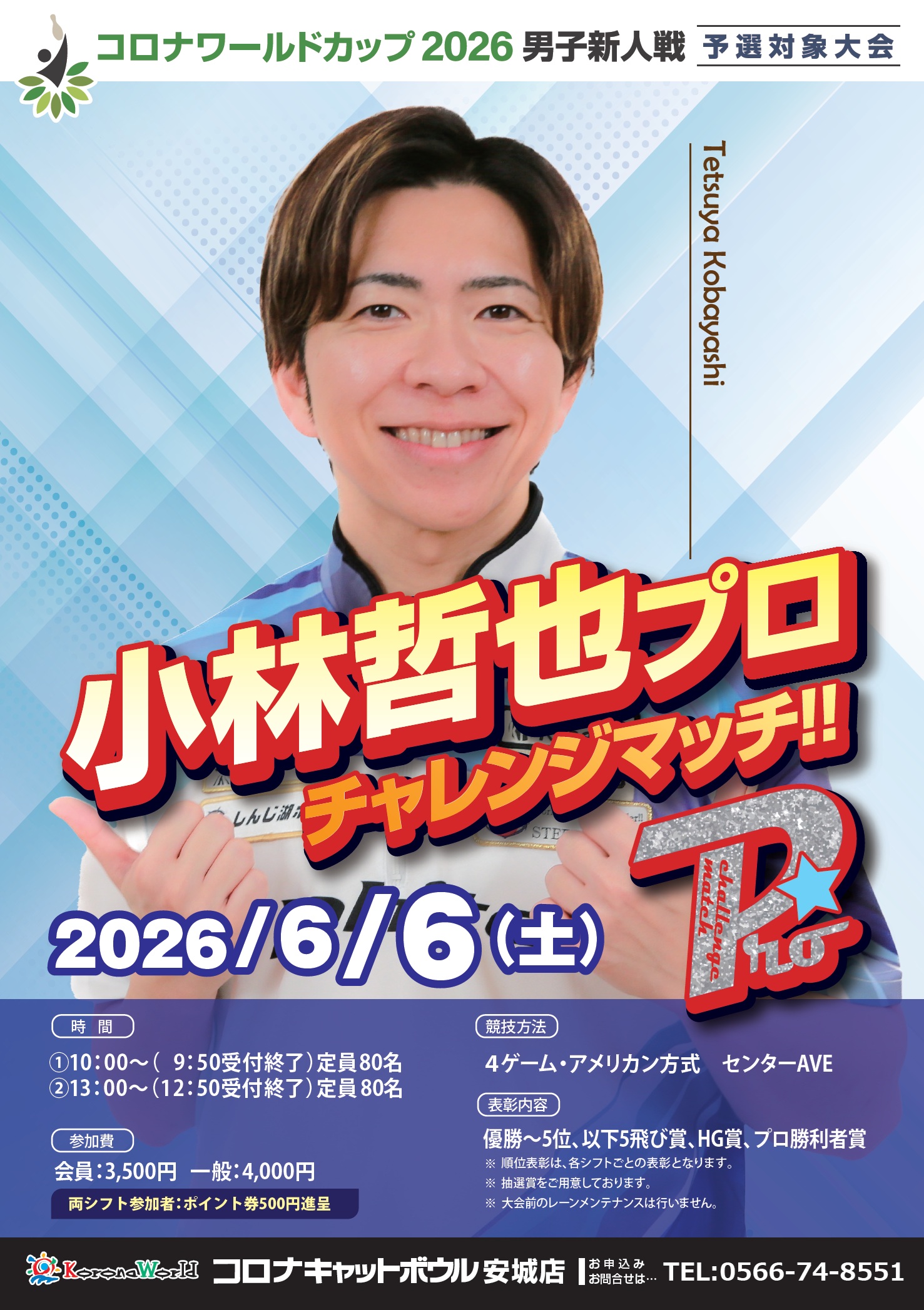 | 大会名 | 小林哲也プロチャレンジマッチ コロナワールドカップ2026 男子新人戦 予選対象大会 |