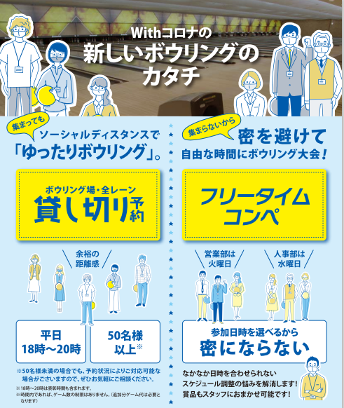 コロナワールドでは、ボウリングの新しいカタチとして密にならないボウリング大会プランをご提案いたします。レクリエーションを企画したいけれど、不特定多数の方がいる場所は不安。団体で行動する事を躊躇している。そんな参加者の皆様のさまざまなお声から、密にならないフリータイムコンペも開催可能となりました。