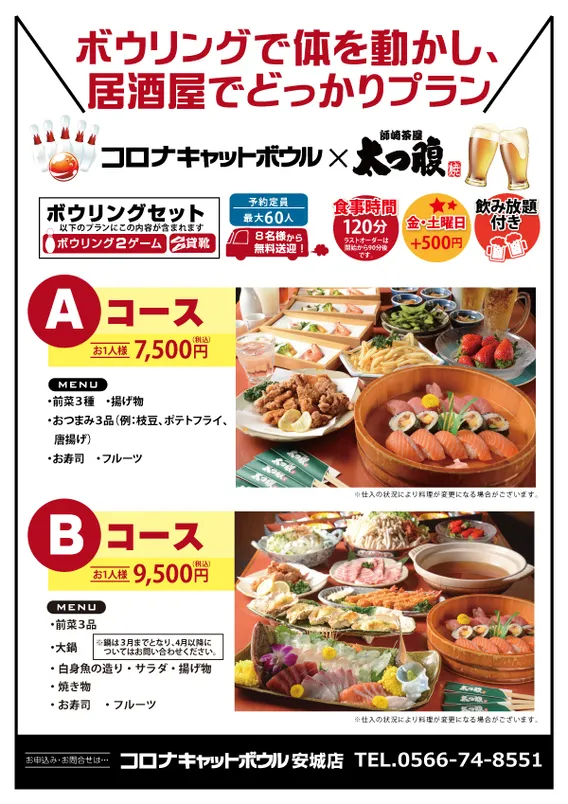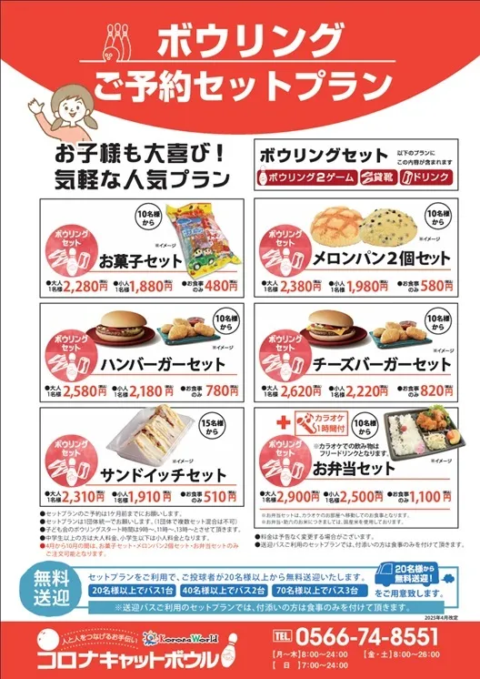 ※ボウリングのみのご予約は前日までにお電話下さい。セットプランは7日前までご予約下さい。
