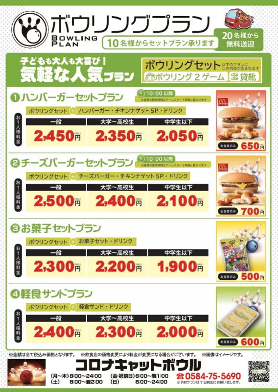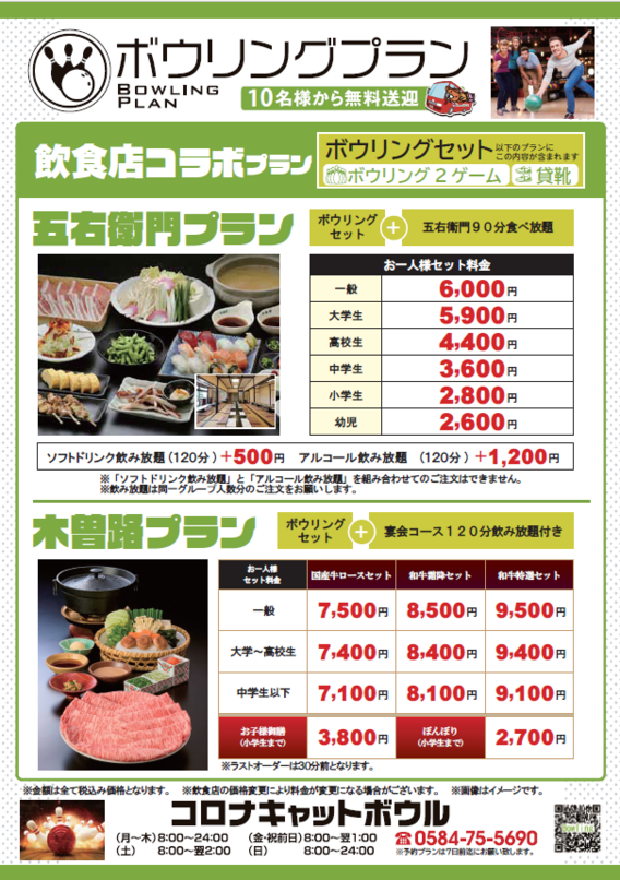 ●ボウリングとお食事の両方をご利用の人数が、規定数を超えた場合にご利用いただけます。(人気プラン20名様以上、コラボプラン10名様以上)