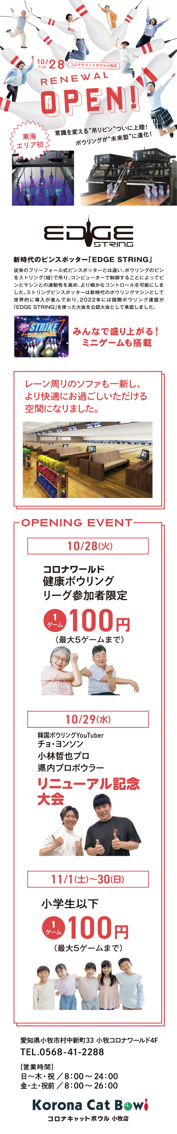 常識を変える「吊りピン」ついに上陸!コロナキャットボウル小牧店10/28リニューアルオープン