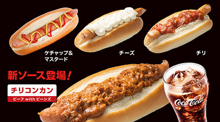 - 小腹が減ったときにぴったり。チリコンカン、チリ、チーズ、ケチャップ&マスタードと、4つの味からお選びいただけます。