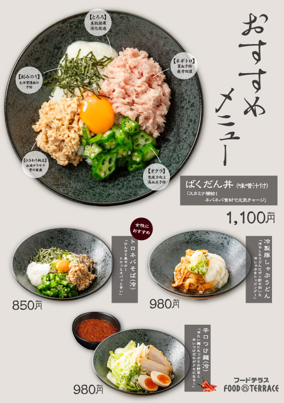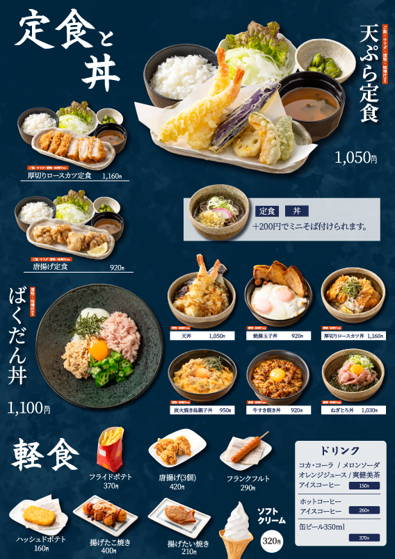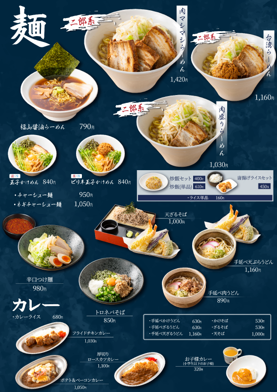 その他、ご当地「福山醤油ラーメン」「手延べ天ぷらうどん」や「天丼」「焼き豚丼」「フライドポテト」「ソフトクリーム」など、大人から子供まで楽しめるメニューが盛りだくさん