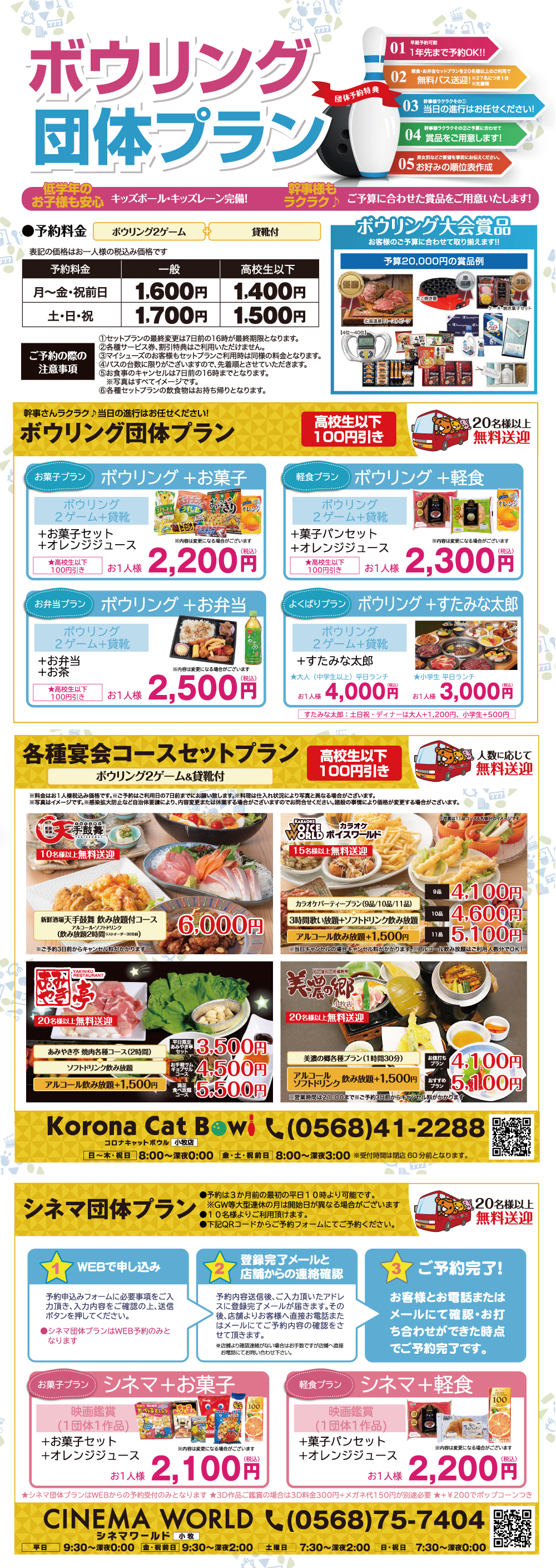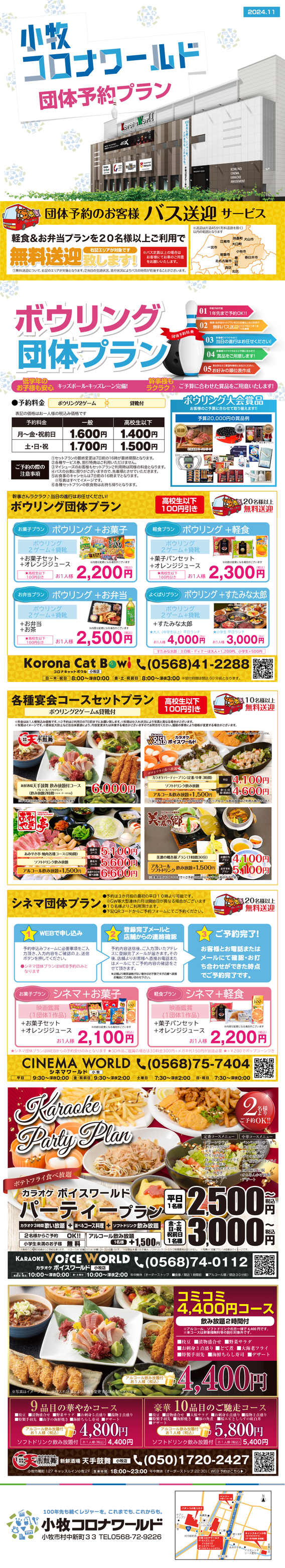 コロナワールドでは、企業様の歓送迎会・忘新年会をはじめ、友達同士のイベントまで、幅広くご利用頂けるように「各種団体プラン」をご用意させて頂いております!!電話1本で簡単にご予約いただけますので幹事様も楽ちんです。ぜひご利用ください♪