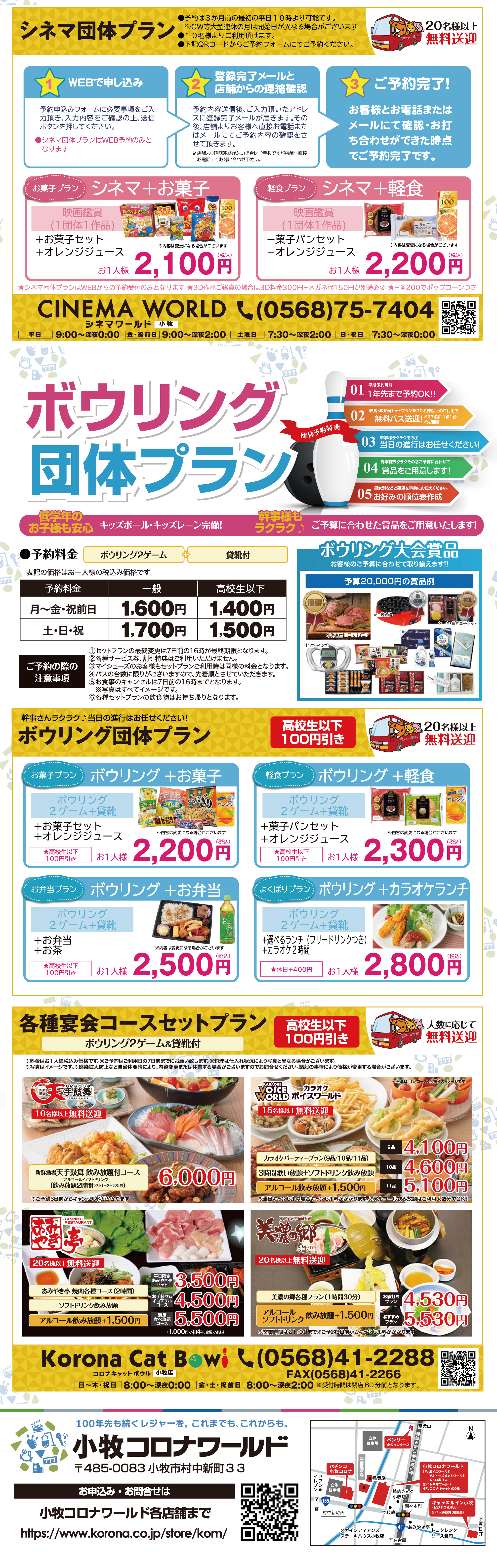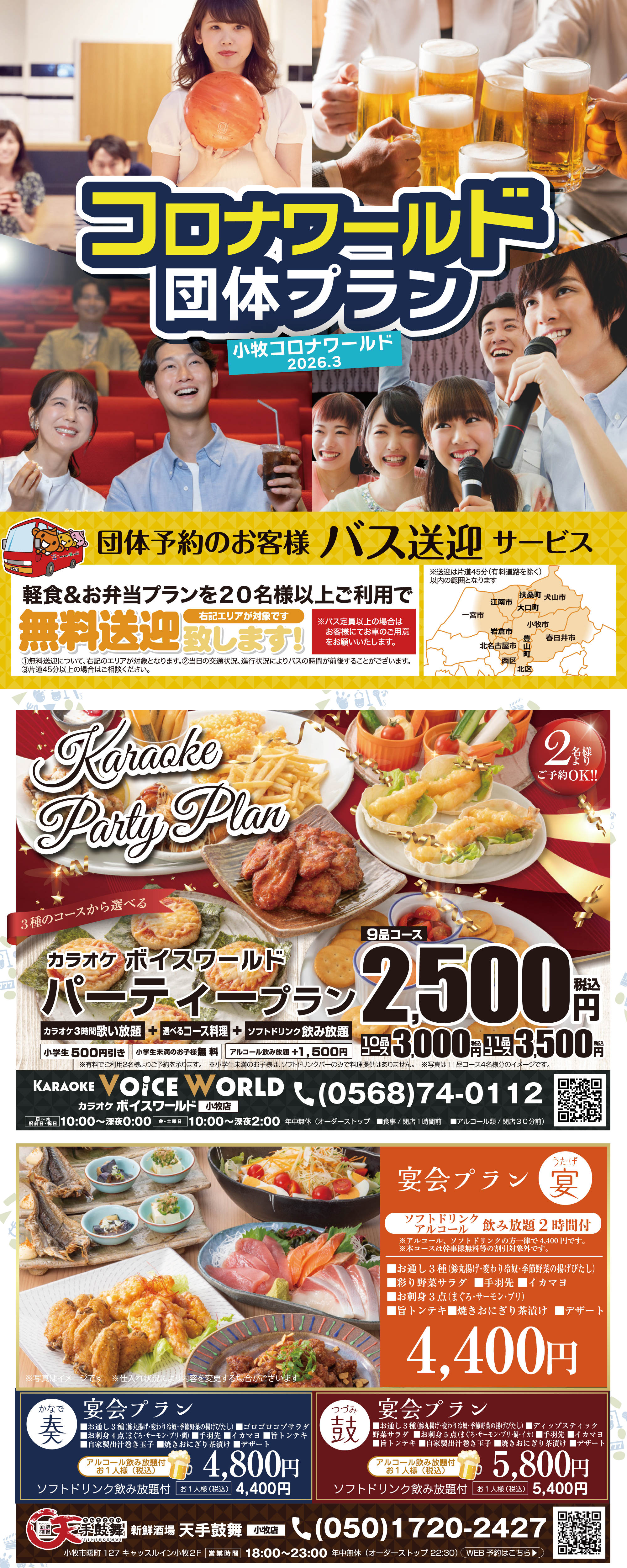 コロナワールドでは、企業様の歓送迎会・忘新年会をはじめ、友達同士のイベントまで、幅広くご利用頂けるように「各種団体プラン」をご用意させて頂いております!!電話1本で簡単にご予約いただけますので幹事様も楽ちんです。ぜひご利用ください♪