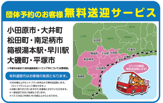 ・40名様以上でマイクロバス最大2台まで手配可能です。
