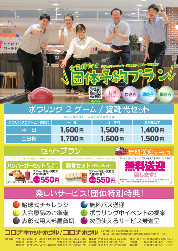 コロナワールドでは、企業様の歓送迎会をはじめ、友達同士のイベントまで、幅広くご利用頂けるように「各種団体プラン」をご用意させて頂いております!!電話1本で簡単にご予約いただけますので幹事様も楽ちんです。ぜひご利用くださいませ♪