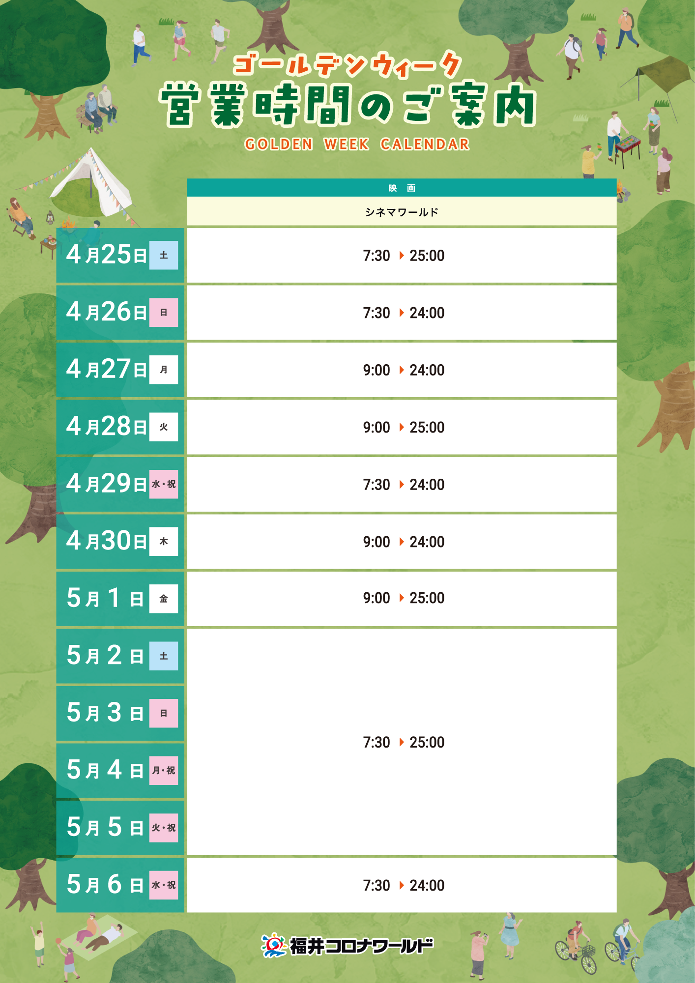 ゴールデンウイーク 営業時間のお知らせ 【福井コロナワールド】
