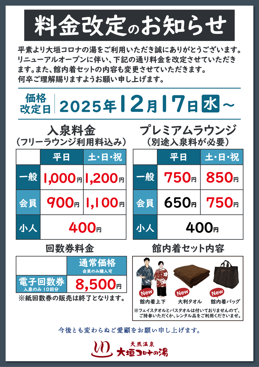 大垣コロナの湯 料金改定のお知らせ