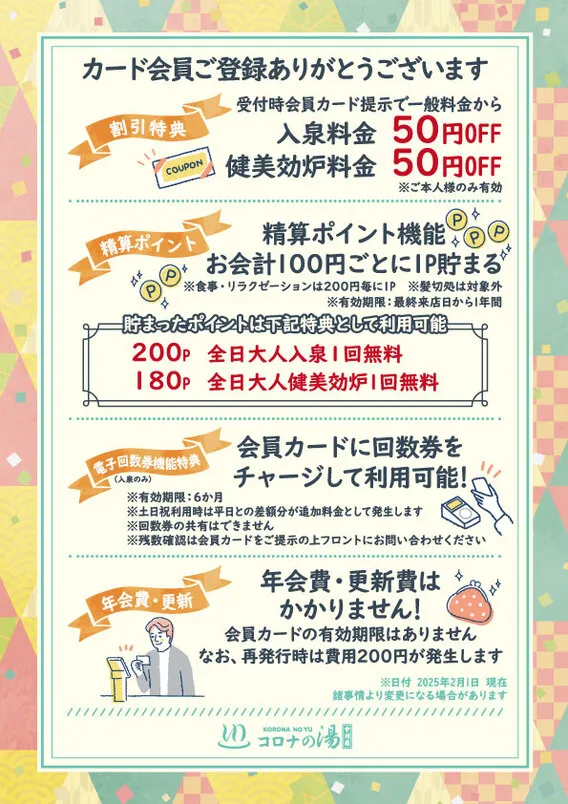 ※お支払い10円につき1ポイント ※さぬきや、リラクゼーションの利用については200円につき1ポイント ※特典をご利用の方は、受付時にお申し出ください ポイント仕様特典一覧 ・180ポイント消費で、フォーレスト利用料1回無料 ・200ポイント消費で、入泉料1回無料 |
