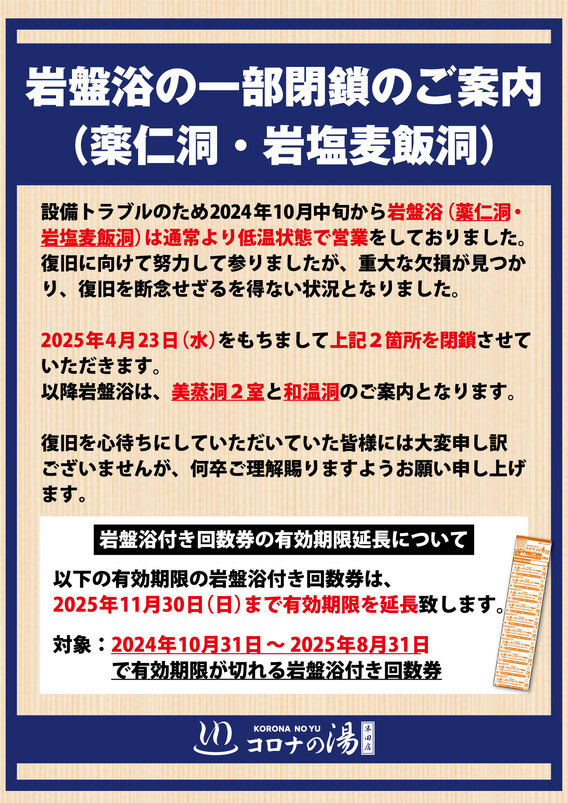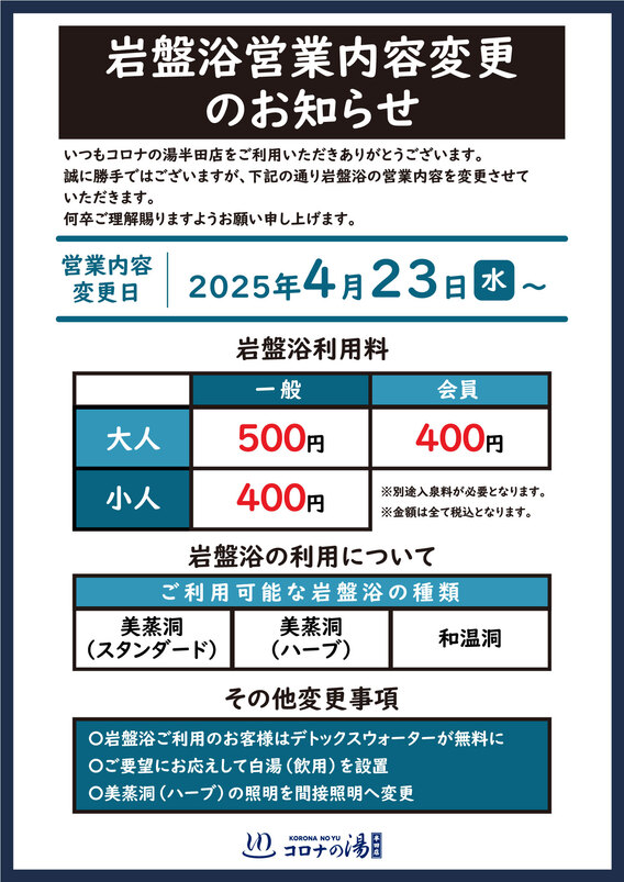 【コロナの湯半田店】岩盤浴営業内容変更のお知らせ