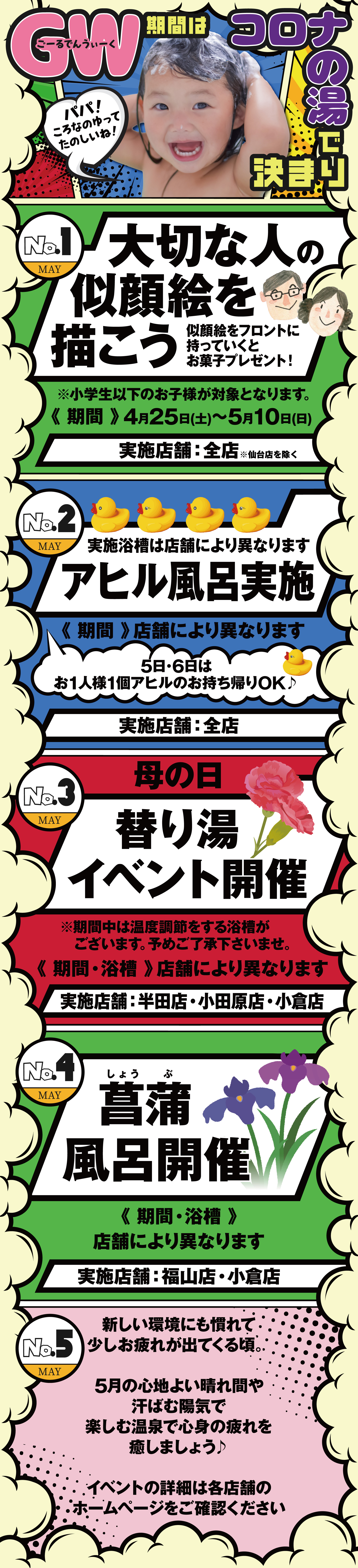 イベントの詳細・実施状況は、コロナの湯各店へ