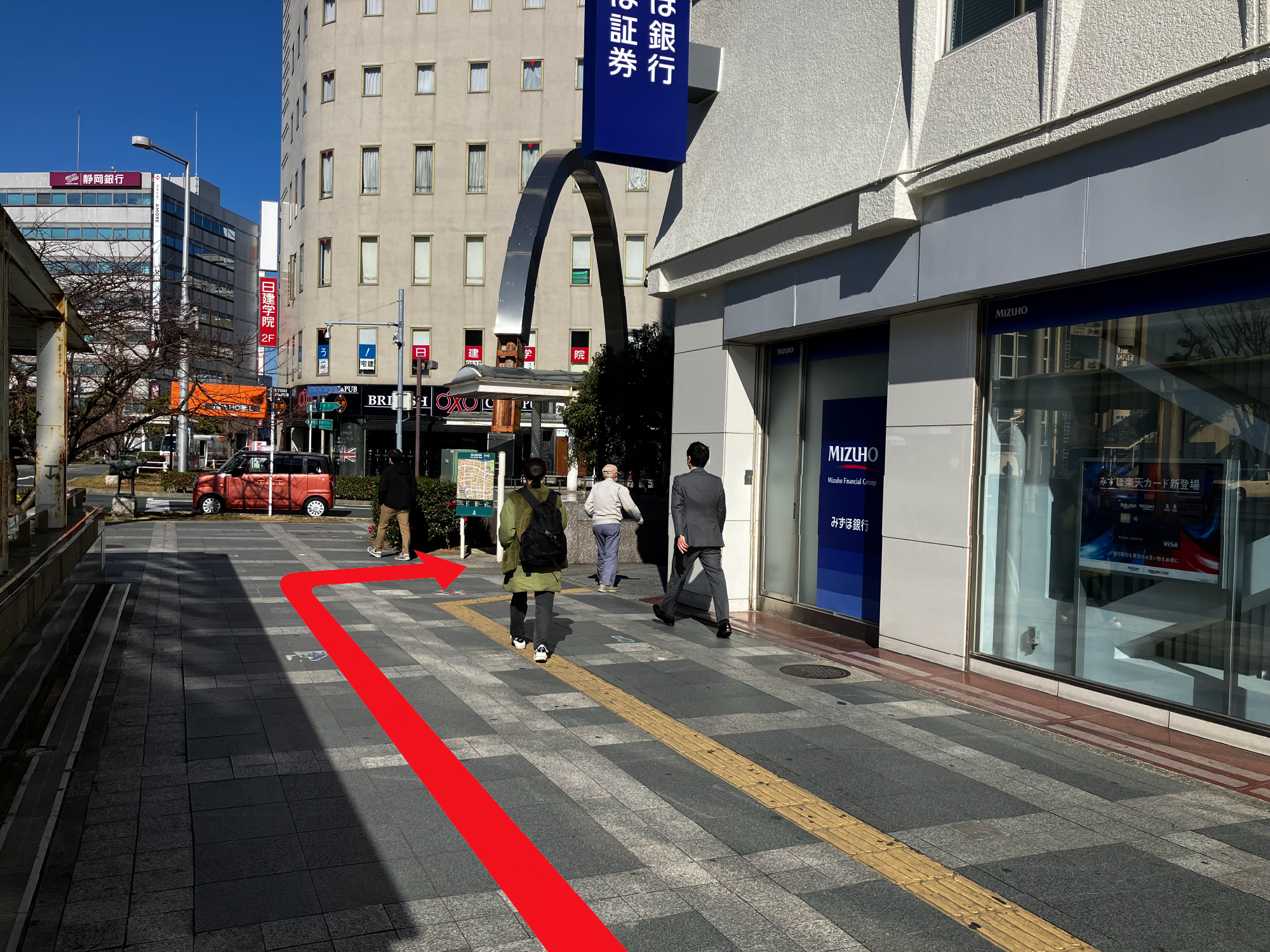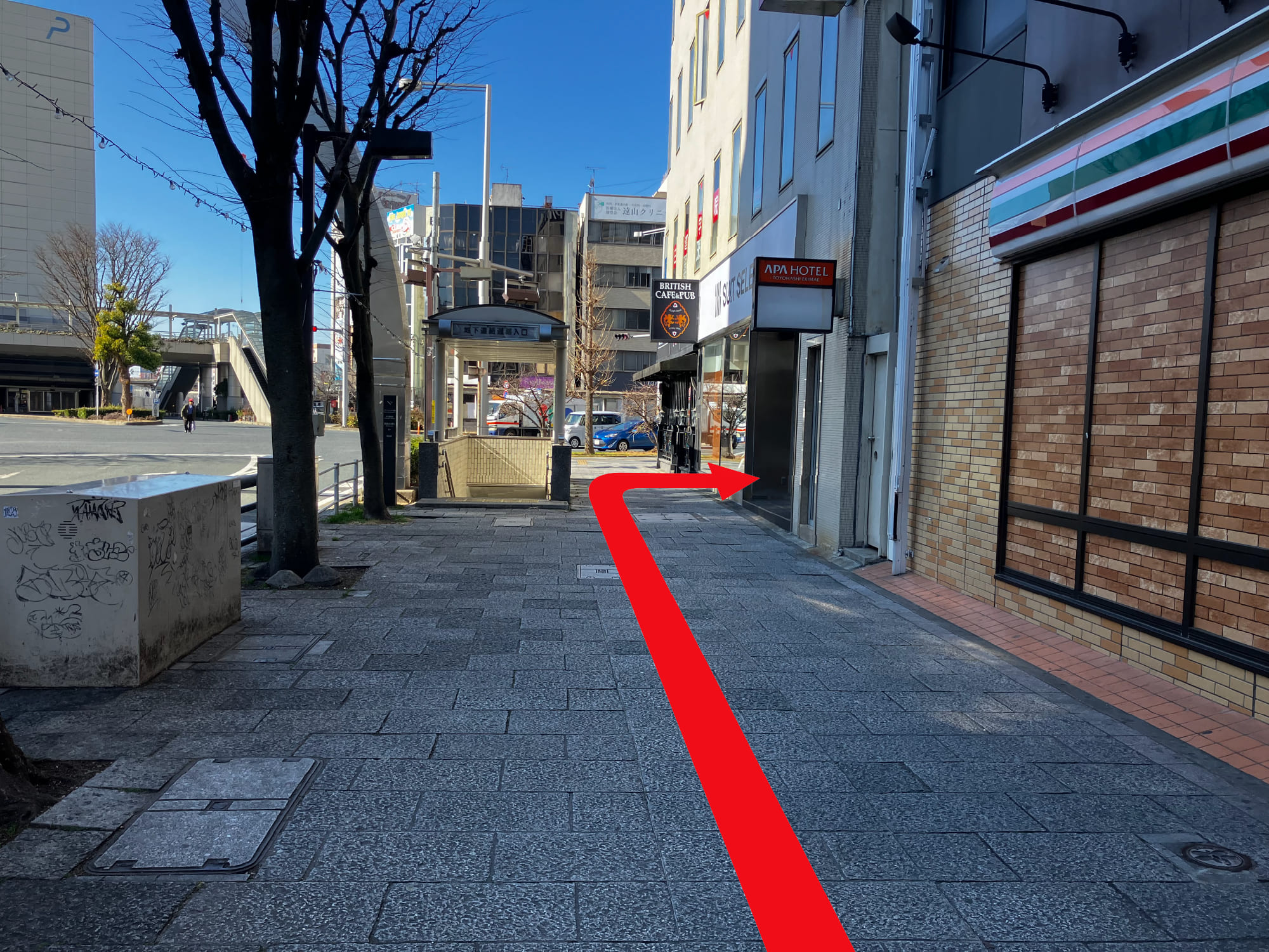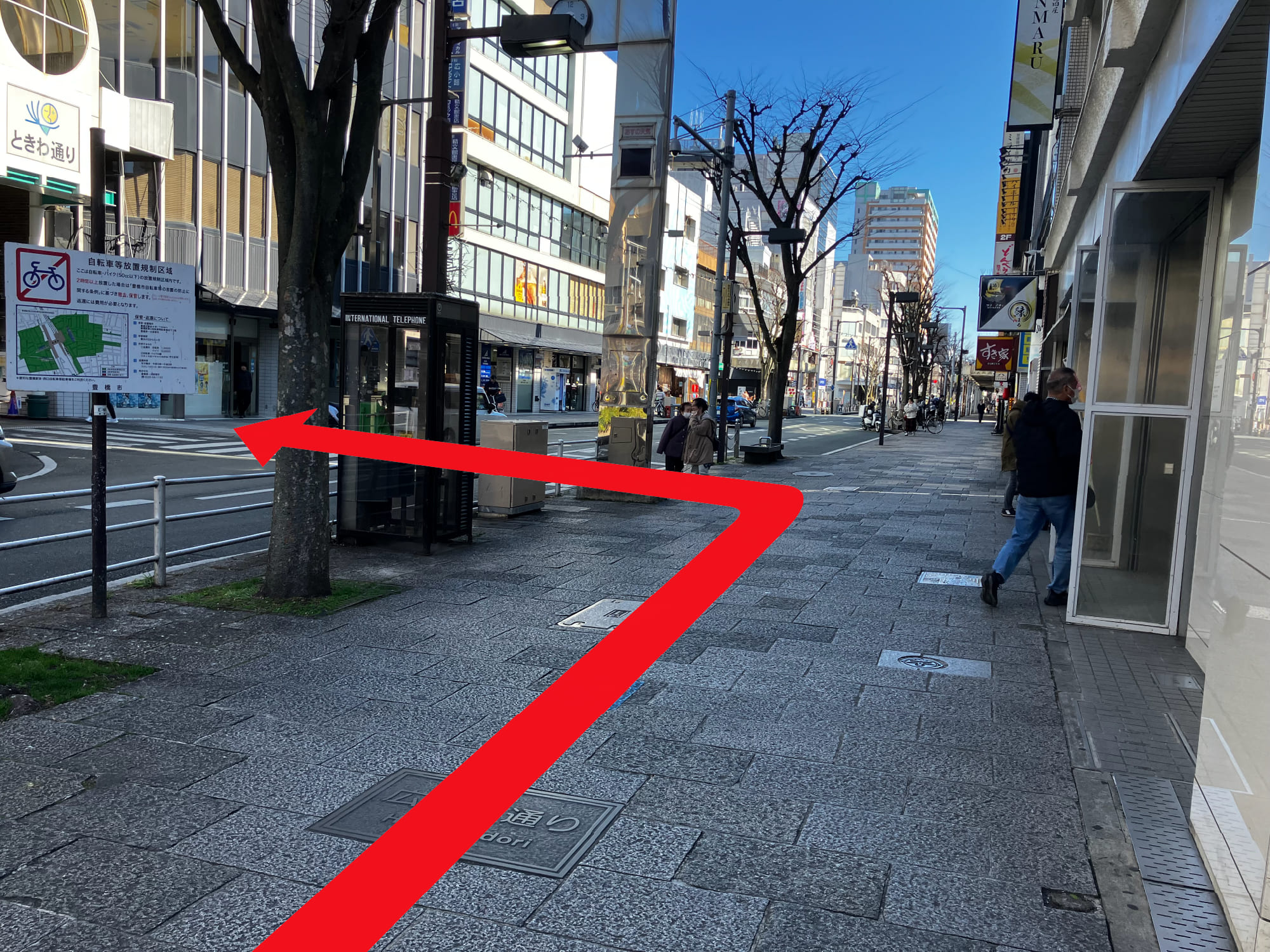 ④歩道橋を降りたら、まっすぐ進み、交差点を右に曲がります。