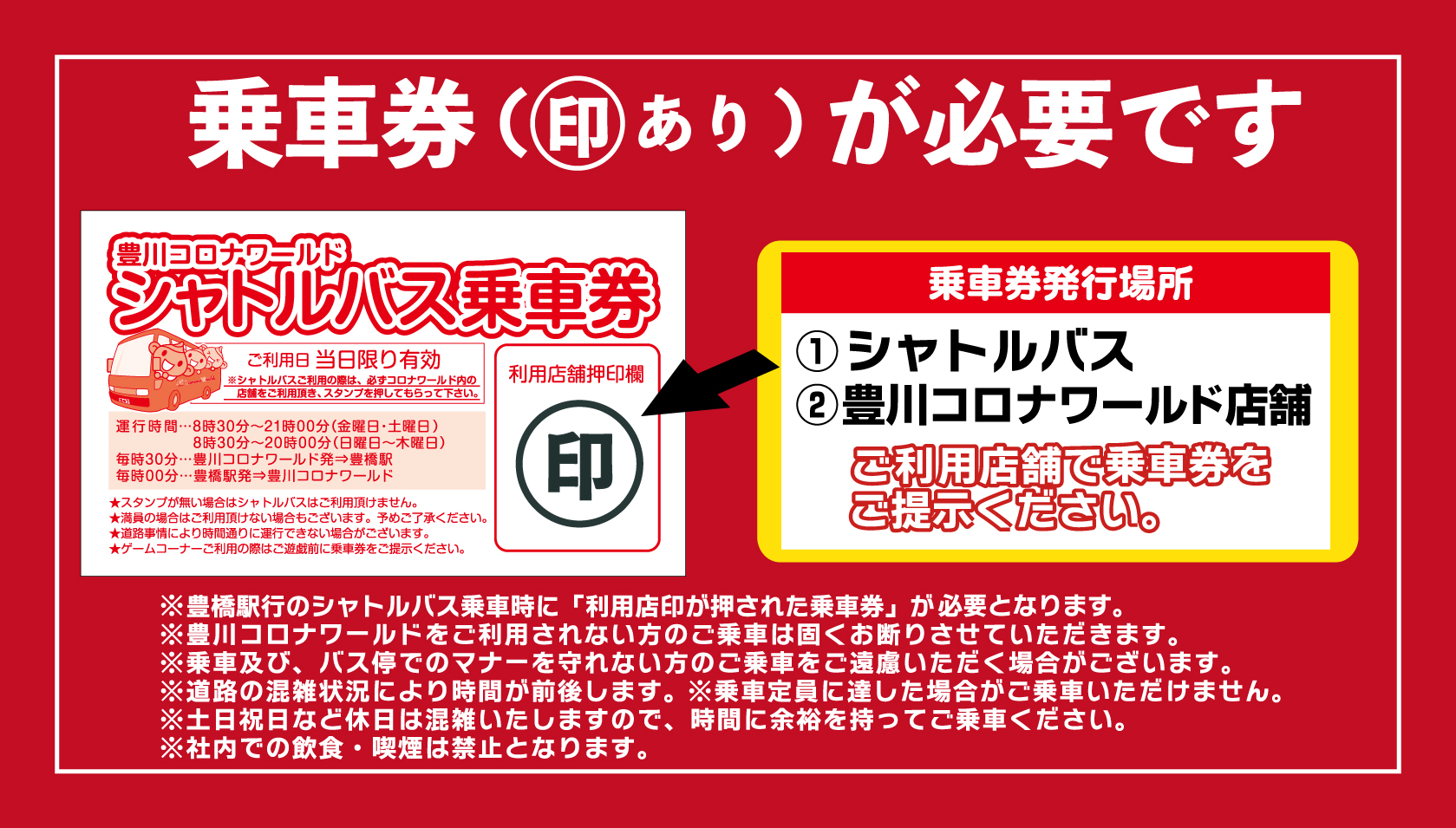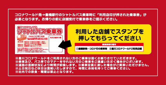※コロナワールド発→豊橋駅行のシャトルバス乗車の際は乗車券に「店舗ご利用印」が必要となります。お帰りの前にご利用店舗の受付へ乗車券をご呈示くださいませ。