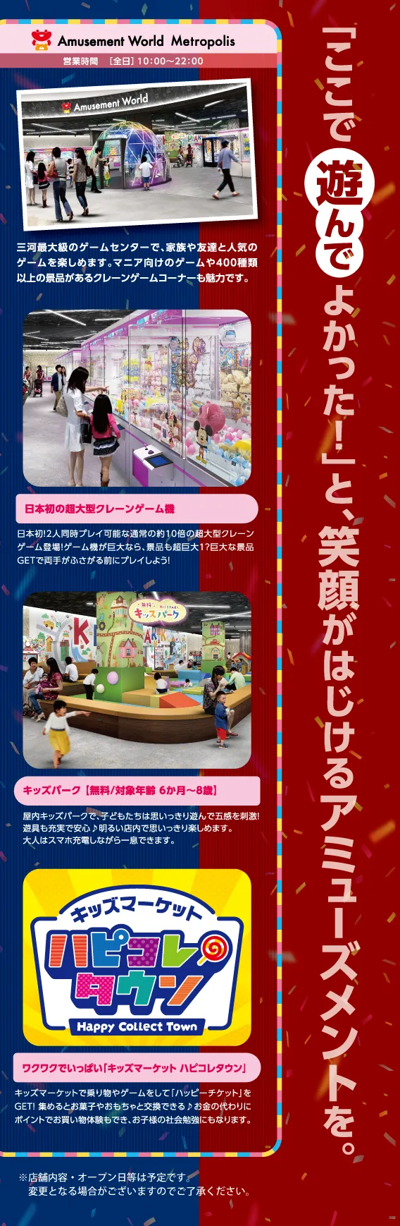 「コロナワールド ららぽーと安城店」と「安城コロナワールド」は、地域社会の余暇に貢献するため、今まで以上に地域のみなさまの毎日に寄り添い、遊びのヨロコビを感じていただける施設を目指し運営を続けてまいります。