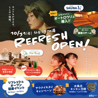 | 2025.10.29 | 女性オートロウリュ導入&無料ドリンクバー設置「仙台コロナの湯」10/31(金)リフレッシュオープン! |